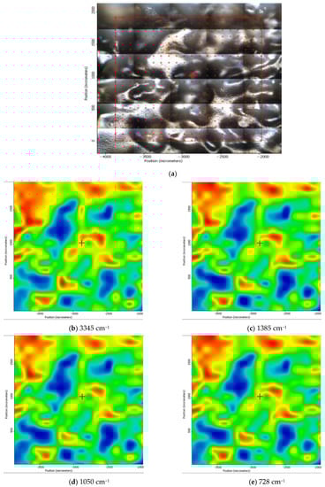 Unfortunately, the spectra obtained (Figure 7) did not show specific bands that could be used in the examination by reflective microscopy in the infrared range (MRI), and therefore, for the examination of the chitosan/sulfonated ethylene–propylene–diene terpolymer surface layer of the composite membrane, we chose a wavenumber from each specific interval of the domain: 3345 cm−1, 1385 cm−1, 1050 cm−1, and 728 cm−1.