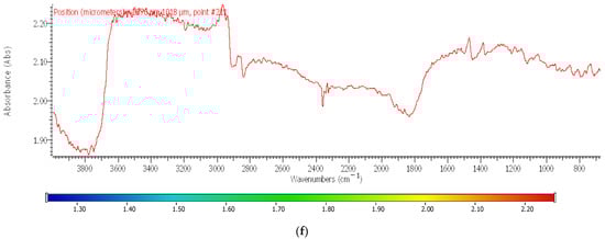 The HD-IR maps obtained for the area of the composite membrane (Figure 8a) showed a remarkable spectral uniformity (Figure 8b–e), embodied in the formal overall spectrum shown in Figure 8f. These results show that the superficial layer examined was almost entirely formed by sEPDM, which fully covered the composite membrane, including the chitosan nanoparticles highlighted in Figure 5c,d. The upper layer of sEPDM that covered the composite membrane could support the pertraction process, considering that its absence can cause the implosion of chitosan particles.