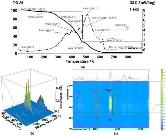 Figure S2 (in the Supplementary Material) shows the released gases, identified as traces, during the thermal decomposition of the sample, through examination at specific wavenumbers: sulfur dioxide (SO2) at 1367 cm−1 (Figure S2a), carbon dioxide (CO2) at 2355 cm−1 (Figure S2b), hydrocarbons at 2964 cm−1 (Figure S2c), and water (H2O) at 3566 cm−1 (Figure S2d).