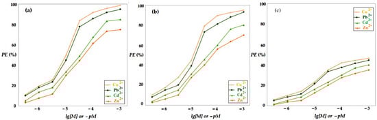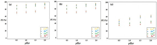 The separation tests were performed with 5 × 10−7–10−3 mol/L solutions of Cu(NO3)2, Cd(NO3)2, Zn(NO3)2, and Pb(NO3)2 obtained in ultrapure water [].