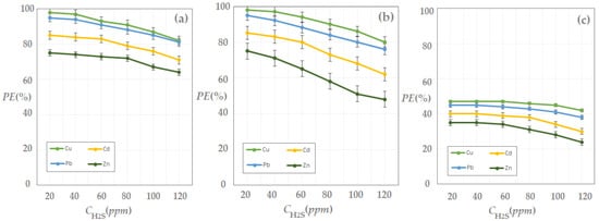 The pertraction efficiency (PE%) for the species of interest (hydrogen sulfide) using the concentration of the solutions [] was calculated as follows, Equation (1):