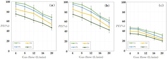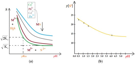 The recuperative separation addressed in this study had as objective the purification of some common gases (nitrogen, methane, and carbon dioxide) from impure hydrogen sulfide, by sequestering it as usable sulfides from acid solutions with a low content of metal ions (Cu2+, Cd2+, Pb2+, and/or Zn2+), resulting as waste from the electronic and electrotechnical industry, and according to the chemical reactions described by Equations (2)–(5):