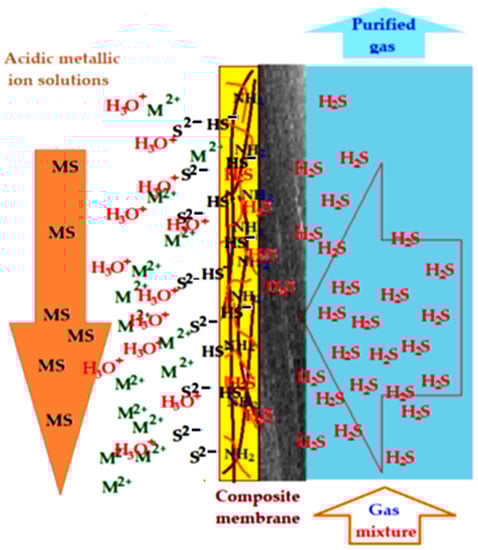 This paper presents the preparation and characterization of composite membranes based on chitosan (Chi), sulfonated ethylene–propylene–diene terpolymer (sEPDM), and polypropylene (PPy), and designed to capture hydrogen sulfide. The Chi/sEPDM/PPy composite membranes were prepared through controlled evaporation of a toluene dispersion layer of Chi:sEPDM 1;1, w/w, deposited by immersion and under a slight vacuum (100 mmHg) on a PPy hollow fiber support. The composite membranes were characterized morphologically, structurally, and thermally, but also from the point of view of their performance in the process of hydrogen sulfide sequestration in an acidic media solution with metallic ion content (Cu2+, Cd2+, Pb2+, and/or Zn2+). The operational parameters of the pertraction were the pH, pM, matrix gas flow rate, and composition. The results of pertraction from synthetic gases mixture (nitrogen, methane, carbon dioxide) indicated an efficient removal of hydrogen sulfide through the prepared composite membranes, as well as its immobilization as sulfides. The sequestration and the recuperative separation, as sulfides from an acid medium, of the hydrogen sulfide reached up to 96%, decreasing in the order: CuS > PbS > CdS > ZnS.