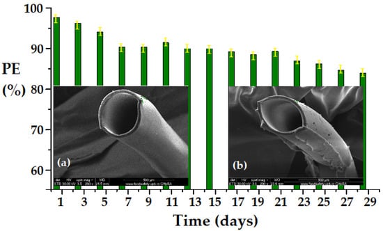 Thus, Figure 4a shows an image of the membrane profile examined from the right side, at a low magnification of 400×, in which the outer and inner diameters of the fiber can be distinguished at around 300 µm. In Figure 4b, at a magnitude of 1000×, one can see the uniformity of the superficial deposition of chitosan and sulfonated ethylene-propylene-diene terpolymer, which formed a consistent active layer (approx. 5 µm). The thickness of almost 30 µm (Figure 4a,b) of the wall of the polypropylene fiber can be also evaluated, in Figure 4c,d, taken at 2000× and 5000× magnifications, respectively. Looking from the right side of the inside of the polypropylene fiber, as shown in Figure 4a, the characteristics of the size and distribution of the pores at magnitudes of 4000× (Figure 4e) and 40,000× (Figure 4f) are highlighted, which confirmed the results presented in our previous works [,,].