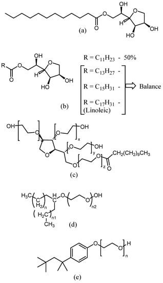 Commercial nonionic surfactants, sorbitan monolaurate Span-20 (Figure 1a) and other Spans (Figure 1b), polyethylene glycol sorbitan monolaurate Tween 20 (Figure 1c), were from Sigma-Aldrich (St. Louis, MO, USA) and made by Dow (Midland, MI, USA). Secondary alcohol ethoxylate Tergitol 15-S-7 (Figure 1d) and Triton X-100 (Figure 1e) were used without special treatment. Initially, these surfactants were dissolved in deionized water to make an aqueous 5 w/v% solution.