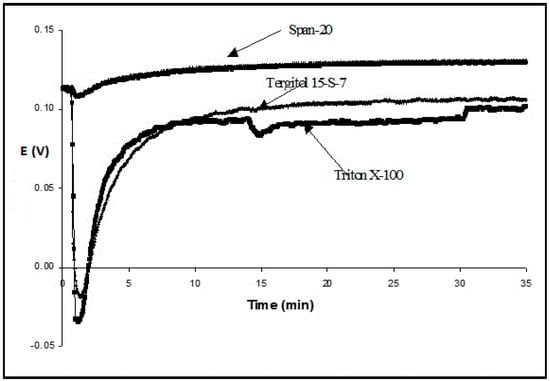 The effects were much less with Span-20, which belongs to the class of anhydrosorbitol esters and does not have polyethoxy chains, whereas Tergitol and Triton have them. The hydrophilic–lipophilic balance (HLB) value of Span-20 is 8.6—the smallest among other surfactants used, but it is still capable of forming oil in a water emulsion []. Porcine bile extract (a very mild natural surfactant) also led to a minimum of the potential, which then returned to the initial value, but all stages were milder and slower. For example, it took more than 30 min to reach the minimum potential for a 1.5% solution.