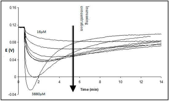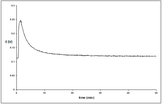 After the addition of Tergitol, the drop in transmembrane potential decreased with the decrease in surfactant concentration (Figure 3). It took more time to reach the minimum and to return. When Tergitol was added to the opposite solution with the reference electrode, the transient kinetics changed its sign, but finally, as expected, the potential practically returned to the initial value (Figure 4).