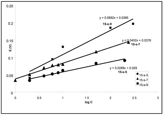 Changes in the transmembrane potential from the initial value to the minimum were proportional to log C when the surfactant concentration changed by three orders of magnitude. The slope of this dependence increased with the length of a chain in surfactant, and it was 69 mV per 10-fold increase of Tergitol 15-S9 concentration (Figure 5). The preliminary addition of 0.5 M KCl into the measuring solution, where the surfactant was later added, led to a simple downward shift of the kinetics (potential changes are larger) but did not change the slope of concentration dependence. In its turn, when the pore size of the filter was decreased from 0.45 μ to 0.05 μ, the dependence of transmembrane potential changes on log C was also practically the same, but the kinetics were slower (Figure 6).