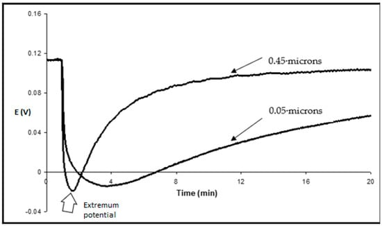 Transmembrane potential as a function of time for impregnated nitrocellulose filters with pore size 0.05 μm and 0.45 μm.
