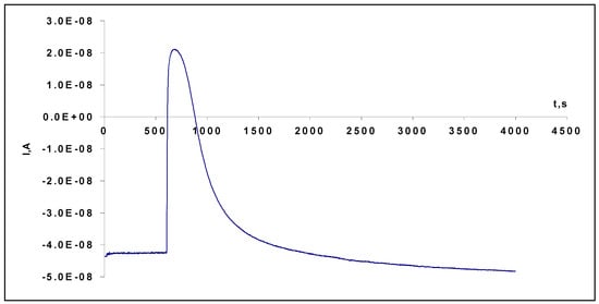 Transient effects were also observed when we measured the transmembrane electric current. The results are presented for Tween 20 (Figure 7). Initially, the current was negative (positive charges move from the acceptor solution with more positive potential), but after the addition of the surfactant, it changed from −4 × 10−8 A to + 2 × 10−8 A at maximum, then finally returned to the initial value. Measured separately, membrane resistance was near 2 MΩ. Based on the maximum current increase by 6 × 10−8 A, this corresponds to experimental changes in the potential near 120 mV. In comparison, the electric resistance of impregnated hydrophobic Teflon membranes, which do not have aqueous channels, is 100–1000 times more.