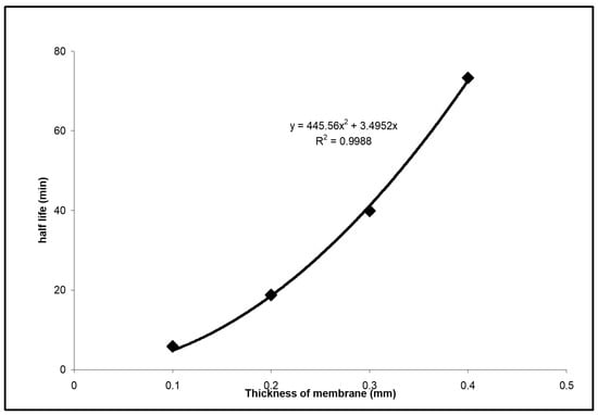 The half-life time of potential relaxation kinetics vs. the thickness of the membrane with 0.05-micrometer pores after the addition of 0.1 wt% Tergitol 15-S-7.