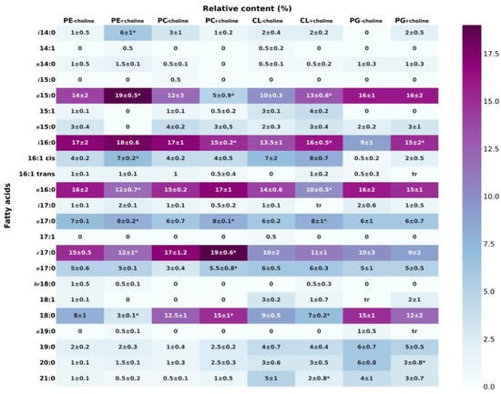 Relative content (%) of fatty acids in the PL classes isolated from the bacteria cultured on the medium without and with choline. a, methyl branch at the anteiso carbon atom; i, methyl branch at the iso carbon atom; n, unbranched acid; c, cyclopropane ring structure; ± standard deviation; * indicates a significant difference in the MW test for choline vs. the lack of choline comparison in each PL. The test was carried out for fatty acids with at least 5% relative content.