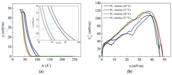 Phospholipids extracted from the L. gormanii bacteria, both supplemented and non-supplemented with choline, form Langmuir monolayers at the air–liquid interface at 20 °C and 37 °C. The obtained isotherms are presented in Figure 2a.