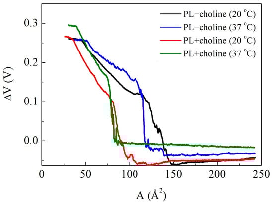 Surface potential changes vs. the mean molecular area () for the PL−choline and PL+choline monolayers at 20 °C and 37 °C.