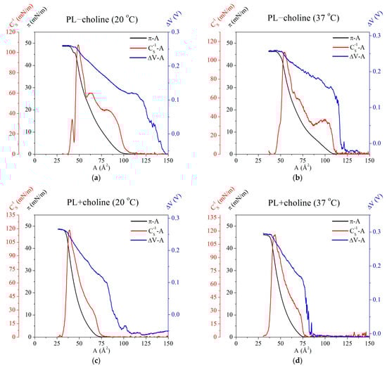 Surface pressure (), compressibility modulus () and surface potential changes (), vs. the mean molecular area (A) for the obtained monolayers: PL−choline at 20 °C (a), PL−choline at 37 °C (b), PL+choline at 20 °C (c) and PL+choline at 37 °C (d).