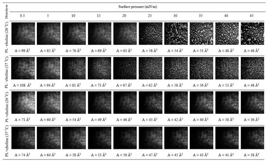 At 37 °C, the changes are adequate, but the values of this parameter are greater than at 20 °C. It is also important to note that the sharp increase in the surface potential corresponds to the extensive surface coverage with the condensed domains, as revealed by the BAM images (see Section 3.4). When the PL−choline films are compressed up to the close-packed state, their values reach ~0.26–0.27 V, while for PL+choline it is 0.27–0.30 V.