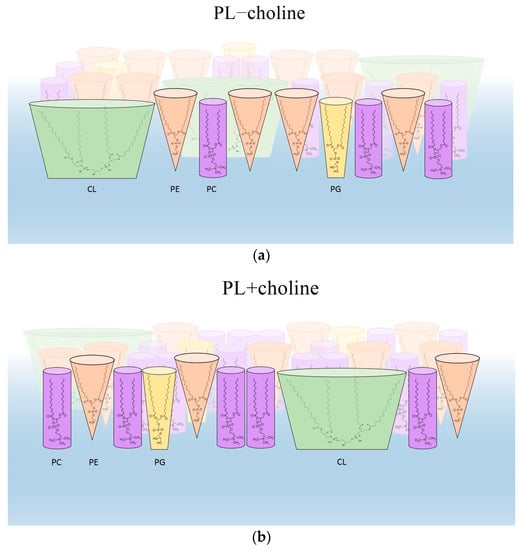 In PL+choline high percentage of PC, cylindrical-shaped phospholipid, results in a greater condensation of the molecules in the monolayer []. On the contrary, as mentioned, the PL−choline mixture contains more CL and PE (Table 2). Due to head-tail mismatch in these compounds, greater steric effects occur, and therefore a lower degree of packing is observed (Figure 6). The increased expansion in the headgroup region of this monolayer is revealed by the smaller values of with respect to PL+choline (Figure 2b). Another cause of the decreased elasticity can be the reorganization of the monolayer detected by the domains’ formation.