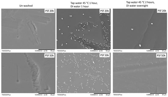 On the other hand, the two PSF membranes show quite interesting results: after washing by the suggested protocol, it was found that plenty of unknown particles with a typical crystal appearance showed up on the membrane surface, as shown in Figure 4. It may come from the precipitation of the pore-protecting agent used by the supplier with insufficient wash. With this type of membrane surface, it is impossible to obtain a defect-free TFC membrane. To overcome this, the wash period was extended from 2 h (1 h tap water and 1 h DI water) to overnight (2 h tap water and overnight DI water), most of these particles can be removed.