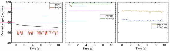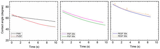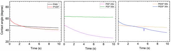 Compared to the corresponding supports, the coating of PVA onto these supports increases the hydrophilicity of these supports, which are rather similar to the literature reports [40]. The CA value gradually reduces over time, demonstrating that the water quickly swelled the PVA layer. For PVDF and PAN supports, the CA value change was not significant, but the slope of reduction is much steeper after PVA coating. The PSF supports have the biggest reduction in CA value, and the coated PSF/PVA membrane exhibited a CA value close to the intrinsic value of the PVA material, denoting that the PVA dominates the CA value. With regard to the PESF sample, even though the neat PESF 30k and 50k show slight differences in the CA value, after being coated with PVA, both membranes show a CA value of ~80°, and also reduce quickly over time. It is well known that PVA has high water permeability [39]; therefore, in the case water vapor condensed on the PVA surface, it will penetrate through the selective layer and condense in the porous supports.