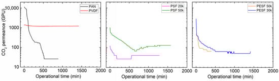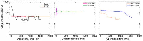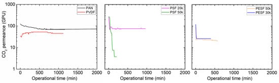 As can be seen from Figure 11, except for the membranes cast on the supports of PVDF and PSF 50k, those of the other four supports experienced a reduction in CO2 permeance over time. The membrane cast on the PAN support started with a rather high CO2 permeance (~500 GPU). However, the permeance decreased sharply in a short period to a low value (~20 GPU). It is well accepted that increasing the RH value will enhance the Pebax gas permeability [36]. For instance, in our previous study, the CO2 permeability was greatly improved as the RH value increased [27,37]. However, in the present study, the CO2 permeance of the Pebax/PAN membrane was sharply reduced during humidification, denoting that the PAN support dominated the gas transport in the TFC membrane, rather than the Pebax layer. The water vapor condensed in the PAN pores and swelled the PAN polymer, which resulted in an increase in the mass transfer resistance of the support layer, leading to a sharp reduction in the gas permeation rate.