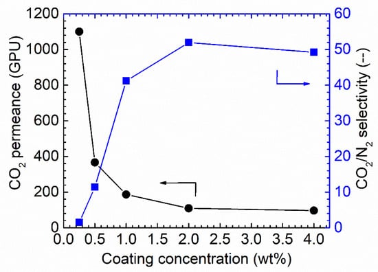 It is well known that the selective layer thickness will result in differences in both gas permeance and selectivity [8,9,33] in facilitated transport membranes or when condensable vapor is involved in the separation system. As varying coating solution concentrations result in different membrane thicknesses, the effect of the Pebax solution concentration on the final membrane performances was studied, as shown in Figure 7.