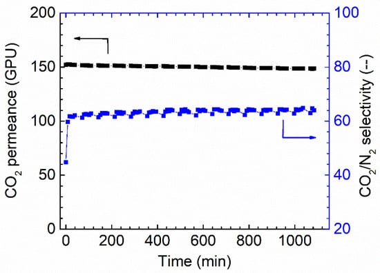 The long-term stability is another critical factor that needs to be considered for membrane separation. The membrane fabricated via 1.0 wt.% coating concentration on PAN support was selected to study the stability. As shown in Figure 8, the membrane shows a relatively stable separation performance during the tested period. Only a slight reduction can be found for the CO2 permeance; at the same time, a slight increase in CO2/N2 selectivity was also observed, and possibly, these small changes come from the fact that the feed pressure compacted the selective layer. In general, the overall separation performances of the Pebax membranes are good.
