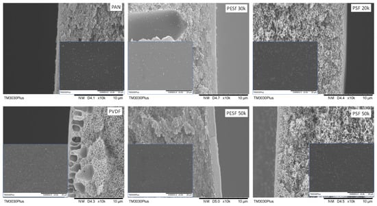 As shown in Figure 5, surprisingly, the PVDF membrane shows the lowest CA (approximately 40°) among all samples. Due to the high fluoride content in the polymer, the PVDF polymer normally shows a CA value in the range of 70~85°, depending on the pore size/porosity and surface morphology [31]. However, the CA value of PVDF can be significantly lower if hydrophilic surface modification is applied [31,32]. In the present study, the CA value for PVDF is much lower than the literature data, possibly due to the hydrophilic surface modification by the supplier. PAN shows a slightly higher CA value (50–60°) compared to the PVDF sample. PSF and PESF supports exhibit even higher CA values in the selected samples. Although the reasons are still unclear, for both PSF and PESF support materials, it is found that the supports of higher MWCO exhibit a higher CA value.