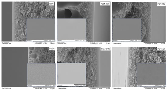The morphologies of the six supports selected were studied using SEM, and their cross-sections are shown in Figure 1. The PAN support and PSF 50k membrane present a sponge-type structure, while the PSF 20k, PESF 30k, and PESF 50k membrane show a finger-type porous structure. The PVDF 30k membrane shows a different structure compared to the other five samples. It has sponge type pores at the bottom side of the support close to the non-woven fabric, but big pores with a diameter of 1~5 μm present just under the selective layer (~1 μm). The different structures of these materials may come from a different membrane fabrication process.