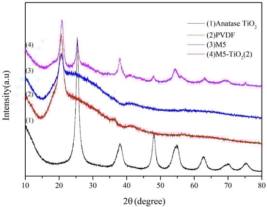 XRD patterns of anatase TiO2, PVDF, M5, and M5-TiO2 (2).
