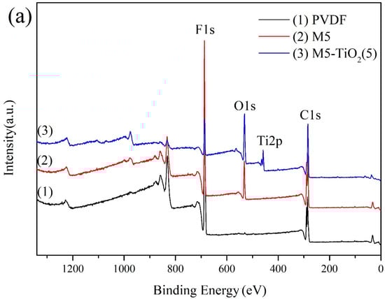 The surface chemical composition of the membrane was analyzed by XPS. Figure 5a shows the full XPS spectra of PVDF, M5, and M5-TiO2 (2). It can be seen that all the membranes have a C 1 s peak at 285.46 eV and an F 1s peak at 687.37 eV. As for M5 and M5-TiO2, the O 1 s peak at 531.97 eV appeared. When TiO2 was deposited on the composite membrane surface, the level peak of Ti 2p appeared, which confirmed the presence of the Ti element. The chemical element composition and content of the membrane are shown in Table 1, and the results are consistent with the above XPS spectra.