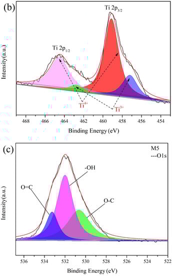 Meanwhile, the two peaks of Ti 2p3/2 and Ti 2p1/2 visible in the high-resolution XPS spectra (Figure 5b) at 459.12eV and 464.5eV, respectively, and the splitting energy between Ti 2p3/2 and Ti 2p1/2 is about 5.38 eV, indicating the existence of normality for Ti4+, similar to the reported data for TiO2 [38]. At the same time, the other two peaks appeared at 462.75 (Ti 2p1/2) and 457.2 eV (Ti 2p3/2) confirming the presence of Ti3+ in the titania lattice [39]. In addition, as shown in Figure 5c,d, by comparing the high-resolution spectrum of O1s of M5 and M5-TiO2 (2) can be found two new peaks from left to right (the new binding energy of M5-TiO2 (2) are 531.10 eV and 529.20 eV), which can be attributed to the Ov and the Ti-O on the structure [27]. The results suggest that such a carboxyl induction strategy can create Ti3+ defects in TiO2 lattices. We think that under high-temperature conditions, the electrons of the carboxyl group will break the Ti-O bond, forming Ov and Ti3+ in TiO2 [40].