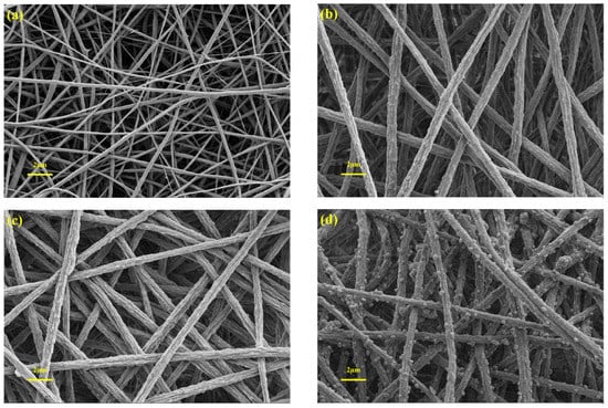 The surface morphology of fibrous membrane were investigated using SEM. As shown in Figure 6, all membranes consist of randomly oriented nanofibers, forming a massive porous structure, which facilitates adequate contact between dyes and active sites [41]. Figure 6a shows that the fibers of PVDF membrane have a smooth surface and different fiber diameters. For composite membranes prepared by adding PEMA, the fiber diameter of the composite membrane became larger and more uniform, and the grooves appeared on the surface of fiber (Figure 6b). At the same time, the fiber morphology of the composite membrane basically did not change after acid treatment (Figure 6c). In addition, with the increase of PEMA content, the fiber diameter gradually increases, and the fiber surface grooves are more obvious (Figure S3a–e). Increased fiber size and surface roughness lead to the increased mechanical strength of the membrane (Figure S4). When the PEMA content is too high (25%) the cracks are found on the fiber surface (Figure S3f), resulting in a reduction in the mechanical strength of the composite membrane (Figure S4). The main reasons are the difference in surface tension between PVDF and PEMA and the formation of the Taylor cone at the needle tip during spinning, which leads to obvious grooves on the surface of blended fibers, and the grooves on the fiber surface are more obvious at high PEMA content. After in situ deposition of TiO2, a large number of micro-nano particles appeared on the surface of the membrane fibers(Figure 6d). With the increase in deposition time, the content of micro-nano particles on the membrane surface gradually increased, and the phenomenon of pore blocking occurred when the time was too long (Figure S5).