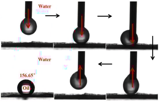 In the process of oil/water separation, the separation performance of the membrane is determined by whether the membrane has excellent superoleophobicity underwater, which is usually verified by underwater oil contact angle (UOCA) and anti-oil droplet adhesion experiments. Dichloromethane was selected as the experimental oil, and the prepared composite membrane was tested for underwater oil droplet adhesion resistance and UOCA. The results are shown in Figure 10. It can be seen that when the composite membrane is completely in water, dichloromethane droplets fully contact the surface of the membrane and then lift up and no oil droplets remain on the surface of the membrane, which indicates that the prepared composite membrane has excellent underwater oil adhesion resistance. At the same time, the contact angle of dichloromethane underwater was tested, and the UOCA was as high as 156.65°, indicating that the prepared composite membrane has underwater superoilphobicity.