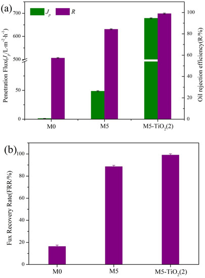 Figure 8b investigates the influence of TiO2 deposition time on the hydrophilicity of the composite membrane, it can be found that the WCA decreases first and then increases with the increase of TiO2 deposition time. With the increase of the deposition time from 0 to 2 h, the values of WCA decrease from 61.16° (M5 to 15.63° (M5-TiO2 (2)), and the values of Jw increase from 318.47 (M0) to 5547.57 L·m−2·h−1 (M5) under 0.1 bar transmembrane pressure. Such excellent superhydrophilicity of M5-TiO2 (2) membrane may be derived from the following key factor: (i) the appearance of TiO2 not only increases the number of hydrophilic groups in the membrane, but also the micro-nano particles make the surface of the fiber rougher; (ii) the deposition of TiO2 is carried out under strong acid and high temperature, the maleic anhydride bond internal of the composite membrane fiber will be further hydrolyzed with the progress of the deposition time, which will increase the overall carboxyl group content of the fiber, resulting in a decrease of WCA and an increase of Jw. When the content of micro-nano particles is too large, the micropore on the membrane surface is blocked (Figure S5), and the surface roughness of the membrane will be reduced, which will increase the membrane contact angle and reduce the permeation flux.
