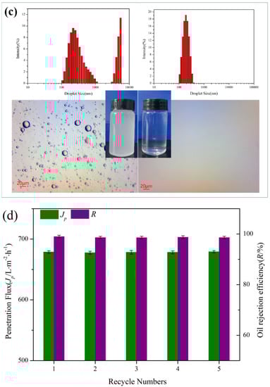 (a) Separation performance of membranes, (b) flux recovery rate of membranes, (c) optical micrographs and particle size distribution of emulsions before and after separation, and (d) recyclability separation experiment of emulsion.