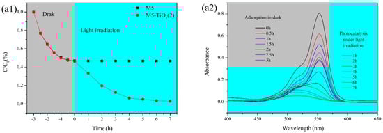 The photocatalytic activity of the composite membranes was analyzed by RhB (cationic dye, initial concentration 5mg/L, pH = 7) and AG-25 (anionic dye, initial concentration 50 mg/L, pH = 3) in the dark and under UV irradiation, respectively, and the results were shown in Figure 13. It can be found from Figure 13(a1,b1) that RhB and AG-25 concentrations decreased slightly during the first 3 h under dark conditions. By adjusting pH, the composite membrane can have a certain adsorption on cationic dyes or anionic dyes, the main reasons are as follows: carboxylic acid pKa = 4 [48], when pH = 7, most of the carboxyl groups on the membrane M5-TiO2 (2) surface will be hydrolyzed into carboxyl ion. Meanwhile, in such conditions, the quaternary ammonium groups in RhB are in cationic form, which promotes ionic polymerization between quaternary ammonium and the carboxylic anionic group [49]. For AG-25 dye, when pH = 3, most of the carboxyl groups on the membrane M5-TiO2 (2) surface will exist in the protonated form. Meanwhile, in such conditions, the sulfonic acid group in AG-25 is in the form of an anion due to the pKa = 2.8 of the sulfonic acid [50], which promotes the ionic dipole interaction between the sulfonic acid anion and the carboxyl group [49]. After adsorption saturation, for the dye solutions containing membrane M5, the concentrations of RhB and AG-25 did not change substantially under UV irradiation. For dye solutions containing membrane M5-TiO2 (2), the concentrations of RhB and AG-25 decreased rapidly under UV irradiation, reaching 97% and 90.2% removal rates, respectively. The changes of UV-vis light absorbance of RhB and AG-25 solution at different times are shown in Figure 13(a2,b2). It can be seen from the figure that RhB solution shows strong absorbance at 554 nm, and the corresponding absorbance at 554 nm almost disappears after adsorption and degradation. AG-25 solution showed strong absorbance at 608 nm and almost disappeared after degradation by adsorption. The main reason is that the conjugated chromophore structure of the dye is destroyed in the photocatalytic degradation process, and the dye molecules are completely degraded into small organic/inorganic molecules or/and ionic products.