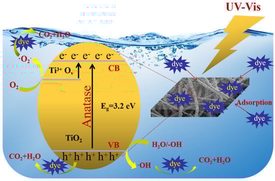 The process of dye removal by M5-TiO2 (2) membrane consisted of two main steps: one was dye adsorption, the other was dye photocatalytic degradation. The former could be achieved through the porous structure of the composite membrane, -COOH/-COO− and TiO2 nanoparticles on the membrane surface. The latter was depicted in Figure 14, anatase TiO2 has been shown by numerous studies to be more photocatalytically active due to having lower surface energy than rutile. Under UV irradiation, the valence band electrons of anatase TiO2 were excited to the conduction band (CB), the photogenerated electrons on the CB reacted with O2 to form ·O2−. The introduction of Ti3+ and Ov can produce an impurity level just below the CB, the electrons trapped by Ov and hopping between Ti3+ and Ti4+, which is helpful to improve the concentration of photogenerated carriers and utilization rate of light. On the other hand, the photogenerated holes on the valence band (VB) reacted with H2O or OH− to form ·OH. Under the action of ·O2−, ·OH, and the photogenerated holes, the organic dye can be effectively degraded into CO2, H2O, and other degradation products [52].