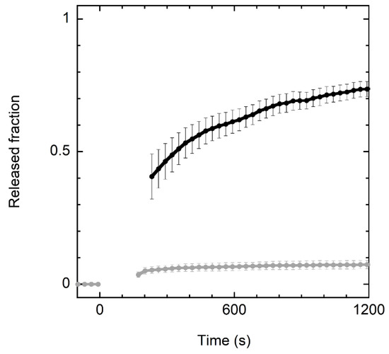 Studies on vesicle release kinetics were performed on an Infinite M200 PRO plate reader (Tecan, Grödig, Austria). The temperature was maintained at 25 °C for all experiments. The percentage of peptide-induced CF leakage was measured by following the fluorescence signal at λex = 490 nm and λem = 520 nm, with an excitation bandwidth of 9 nm and emission bandwidth of 20 nm and a spacing of 30 s. Measurements were repeated three times. Total leakage was obtained by adding Triton X-100 (SIGMA Life Science, Merck, Darmstadt, Germany) at a 1 mM final concentration. The fraction of peptide-induced leakage was determined as