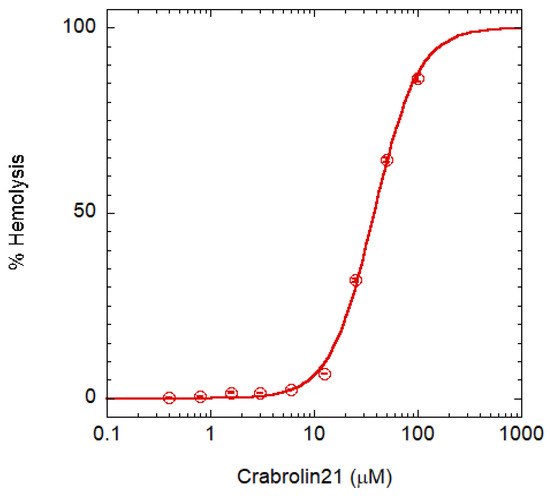 Toxicity was assayed on red blood cells (RBCs) Figure 4. A crabrolin concentration higher than 100 μM is required for complete hemolysis (HC100%). Taking into account that the MIC is 4 μM for several bacteria, the peptide has a therapeutic index (i.e., the ratio between HC100% and MIC) >25. Even though this commonly used assay of AMP selectivity has some limitations [21], crabrolin21 selectivity is in line with those of most AMPs [31].