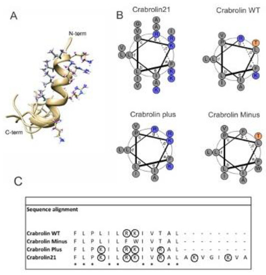 A helical-wheel comparison of crabrolin21 with previous crabrolin peptides (crabrolin WT, crabrolin Plus, and crabrolin Minus) is reported in Figure 5B, and their sequence alignment is in Figure 5C. Analysis of the peptides indicates that all the charged residues are located in the same region of the peptide and suggests that other residues can be modified as well. On the other hand, the hydrophobic surface could also be modified, bearing in mind that variants of specific residues, such as Pro3, may affect the hemolysis of the peptide [36].