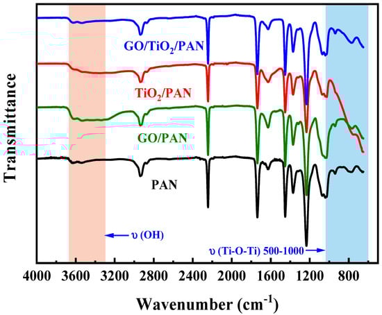 Strong peaks at 700 cm−1 to 1000 cm−1 in the spectra of the TiO2/PAN membrane were ascribed to the Ti-O-Ti structure [46], which demonstrates the in situ generation of the TiO2 nanoparticles in the TiO2/PAN membrane during the NIPS. Due to the exchange of solvent (the DMAc) and non-solvent (DI water) between membrane matrix and coagulation bath, the sol–gel reaction of TBT occurs when it comes into contact with the DI water. This forms TiO2 nanoparticles in the membrane matrix [43]. Moreover, what’s particularly interesting is that, despite the same amount of the precursor (TBT) being added to the casting solutions, higher absorption peak intensities at 700 cm−1 to 1000 cm−1 were observed in the TiO2/PAN than in the GO/TiO2/PAN membrane.