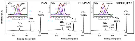 XPS spectra of the PAN, TiO2/PAN and GO/TiO2/PAN membranes. * indicates the element being analyzed.