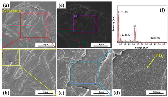 As shown in Figure 4a–d, nanoscale particles were uniformly distributed on the surface of the GO nanosheets, whereas the surface of the original GO nanosheets prepared by the modified Hummer’s method was smooth and flat (as shown in Figures S4 and S5). In Figure 4f, Ti was detected on the surfaces of the GO nanosheets, and the C/O value (3.18) was lower than that of the original GO (5.97), indicating that TiO2 nanoparticles were synthesized in situ on the surfaces of the GO nanosheets through the sol–gel reaction of TBT during the membrane-forming process of the NIPS. Additionally, the chemical structure of the isolated GO nanosheets were characterized using FTIR.