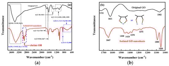 As shown in Figure 5a, the characteristic peaks at 3650 to 3100 cm−1, 1730, 1627, and 1413 cm−1 were ascribed to –OH, –COOH, and C=O stretching mode vibration of the GO nanosheets, respectively. The peaks at 1220, 1090, and 1050 cm−1 were attributed to C–O–C stretching mode vibration of the GO nanosheets. These characteristic peaks were observed in both the GO nanosheets. However, compared to the original GO, characteristic peaks of TiO2 at the wavenumber of 800 cm−1 and 500 to 1000 cm−1 were only observed on the surfaces of the isolated GO nanosheets, indicating the existence of TiO2 nanoparticles on the same surface. This finding was consistent with the EDX analysis (Figure 4). Interestingly, characteristic peaks at 1458, 1419, 1379, 1275, and 1090 cm−1 were detected on the surfaces of the isolated GO nanosheets (Figure 5b). According to Jankovic et al.’s research, the peaks from the 1090 to 1500 cm−1 region were attributed to the conjugate hydroxyl structure between TiO2, benzoic acid, and hydroxybenzoic acid, resulting from the chelation of titanium atoms with both phenolic and carboxylic groups [50]. Hence, it is believed that TiO2 nanoparticles were bonded to the GO by Ti atoms chelating with hydroxyl and carboxyl groups on the surface and edge of the GO nanosheets.