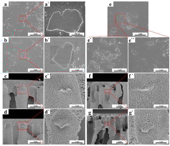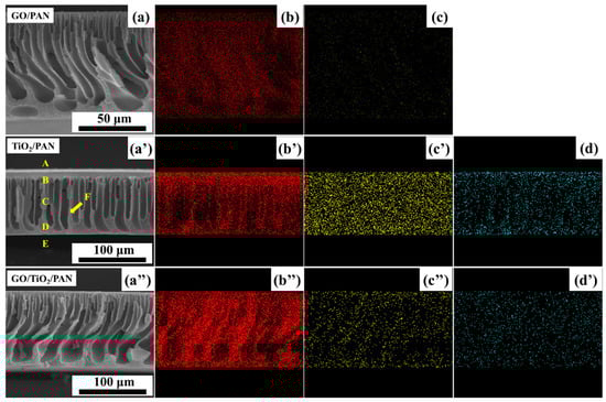 In Figure 6a–d`, scattered GO nanosheets were observed on the top surface and pore walls of the GO/PAN membrane, indicating that GO nanosheets, along with TiO2 nanoparticles and other hydrophilic additives, migrated to the phase interfaces (top surface and pore walls) through the solvent and non-solvent exchanges [38]. Figure 6e–g` show that numerous TiO2@GO nanosheets stacked layer-by-layer were observed on the top surface and pore walls of the GO/TiO2/PAN membrane. This suggested that high hydrophilicity of the TiO2 nanoparticles on the surface can provide a significant driving force for the TiO2@GO nanosheets to migrate to the membrane top surface and pore walls. To investigate the distribution of TiO2 nanoparticles and GO nanosheets in the membrane matrix, the distributions of Ti, C, and O elements in the membrane cross-section were detected by EDX.