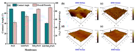 (a) contact angle and overall porosity of the PAN, GO/PAN, TiO2/PAN, and GO/TiO2/PAN MMMs, 3D AFM images and mean roughness of the (b) PAN, (c) GO/PAN, (d) TiO2/PAN, and (e) GO/TiO2/PAN MMMs top surface.