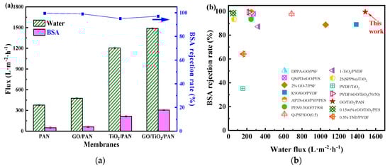 (a) Pure water flux and BSA rejection rate of the PAN, GO/PAN, TiO2/PAN and GO/TiO2/PAN membranes, (b) Comparison of the filtration performance in current work with others.