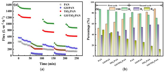 Anti-fouling parameters were calculated using Equations (3)–(6), and the results are presented in Figure 11b and Table S2. It can be seen that the FRR and Ri increased, while the Rt and Rir decreased, from the PAN, GO/PAN, TiO2/PAN, and GO/TiO2/PAN membranes in the two anti-fouling cycles. This suggests that the absorbed BSA molecules on the GO/TiO2/PAN membrane top surface were more easily washed away than those on the other three. As discussed in Figure 9, the high hydrophilicity and smooth surface of the GO/TiO2/PAN membrane ensured that the protein molecules were not easily absorbed on its top surface. The absorbed protein molecules were easily washed away, thereby endowing the membrane with excellent anti-fouling performance.