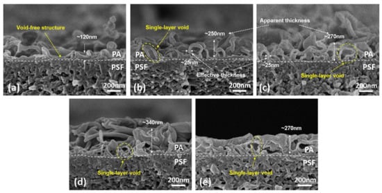 Scanning electron microscopy (SEM) images of the cross-section of the TFC membrane prepared at various TMC concentrations (MPD concentration is fixed at 2%). (a) 0.01%, (b) 0.05%, (c) 0.1%, (d) 0.2%, (e) 1%. Reproduced from reference [60] with permission from Elsevier (2017).