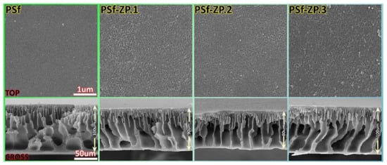 Scanning electron microscopy (SEM) pictures of the cross-section and top surface of support layers with various ZnO@PMMA loading (0, 0.125, 0.25, and 0.5 wt.%) Reproduced from reference [83] with permission from Elsevier (2022).